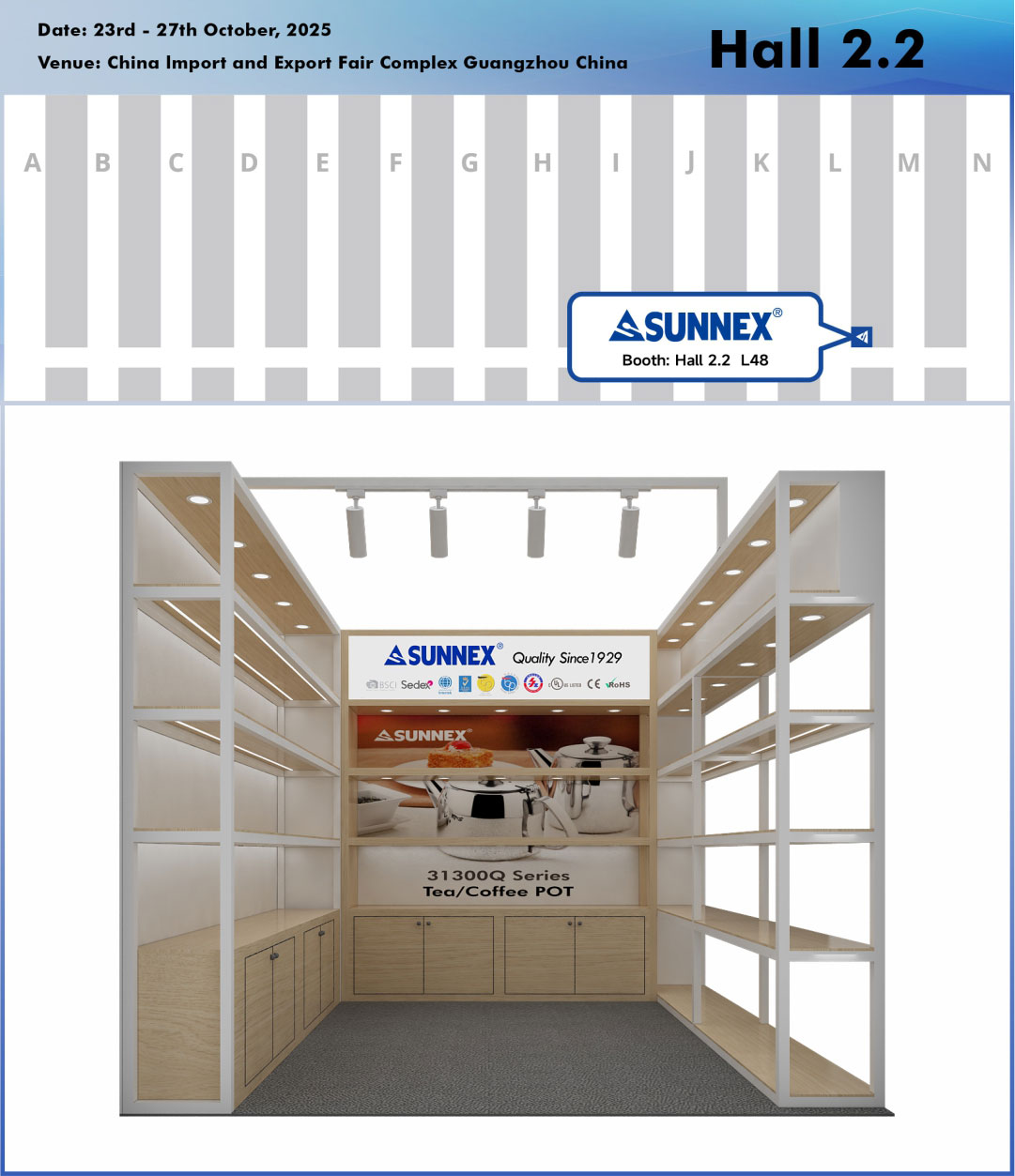 Guangzhou, చైనా - అక్టోబర్ 2025 - SUNNEX సెంచరీ (షెన్జెన్) లిమిటెడ్, ప్రీమియం బఫే వేర్, చాఫింగ్ డిష్లు, డ్రింక్ డిస్పెన్సర్లు మరియు గృహోపకరణాల తయారీలో అగ్రగామిగా ఉంది, అంతర్జాతీయ కొనుగోలుదారులు, మీడియా మరియు పరిశ్రమ నిపుణులను మా బూత్లను 138వ చైనా ఎఫ్ ఎయిర్పోర్ట్ మరియు ఎగుమతి ఎఫ్ ఎయిర్పోర్ట్లో సందర్శించడానికి ఆహ్వానించడం సంతోషంగా ఉంది.